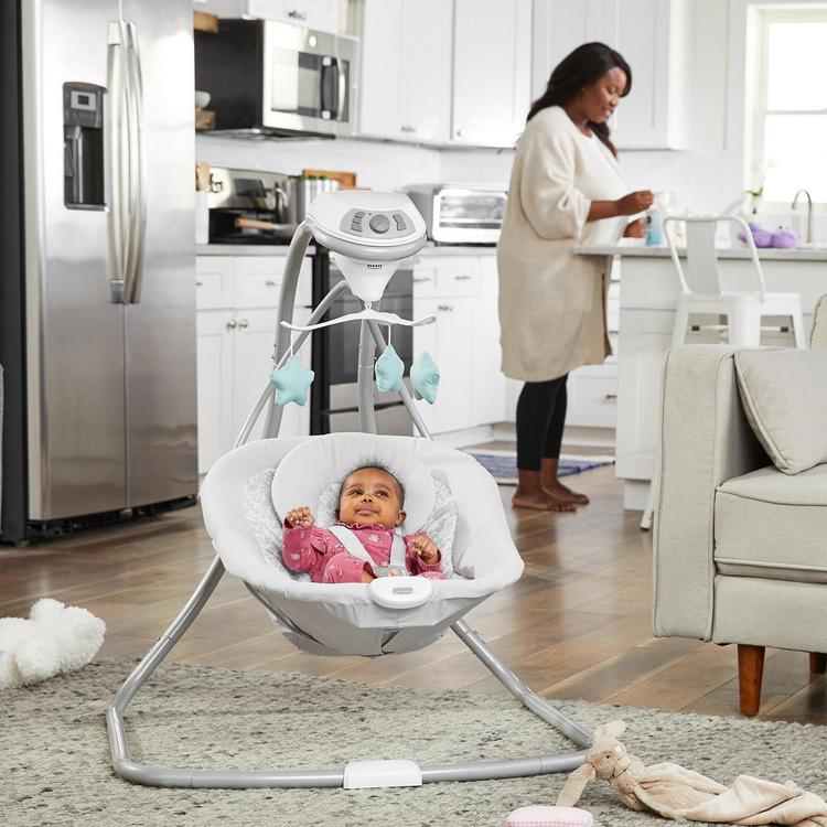 The Graco® Simple Sway™ Swing is fully featured to help you soothe and comfort baby. Gentle, side-to-side swaying and 6 different speeds allow you to customize to baby's preference. This swing also features 15 songs and sounds, a cozy head support, and soothing two-speed vibration to keep your little one content. The option to plug in or use batteries makes this swing ideal for any room in the home.