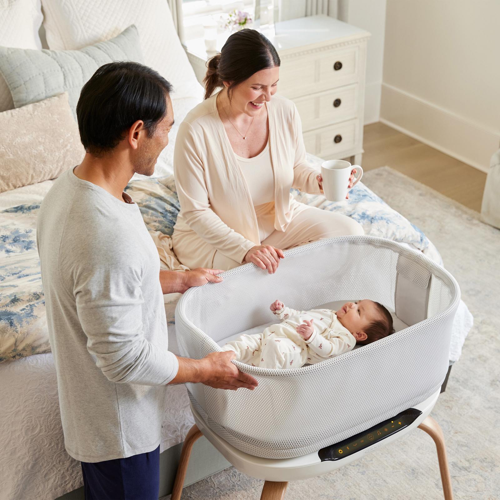The Graco SmartSense Soothing Bassinet hears your baby's cries and responds with synced sound and motion, helping to create more peaceful, happy moments for you and your child. This baby bassinet responds by gradually adjusting the gentle motion and white noise, cycling through soothing combinations to help lull baby back to sleep. It helps create a fully immersive sleep environment for baby by offering parents thousands of soothing combinations to choose from, including gentle motions, soft vibration, multiple speeds, white noise, and calming music.