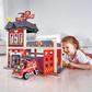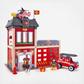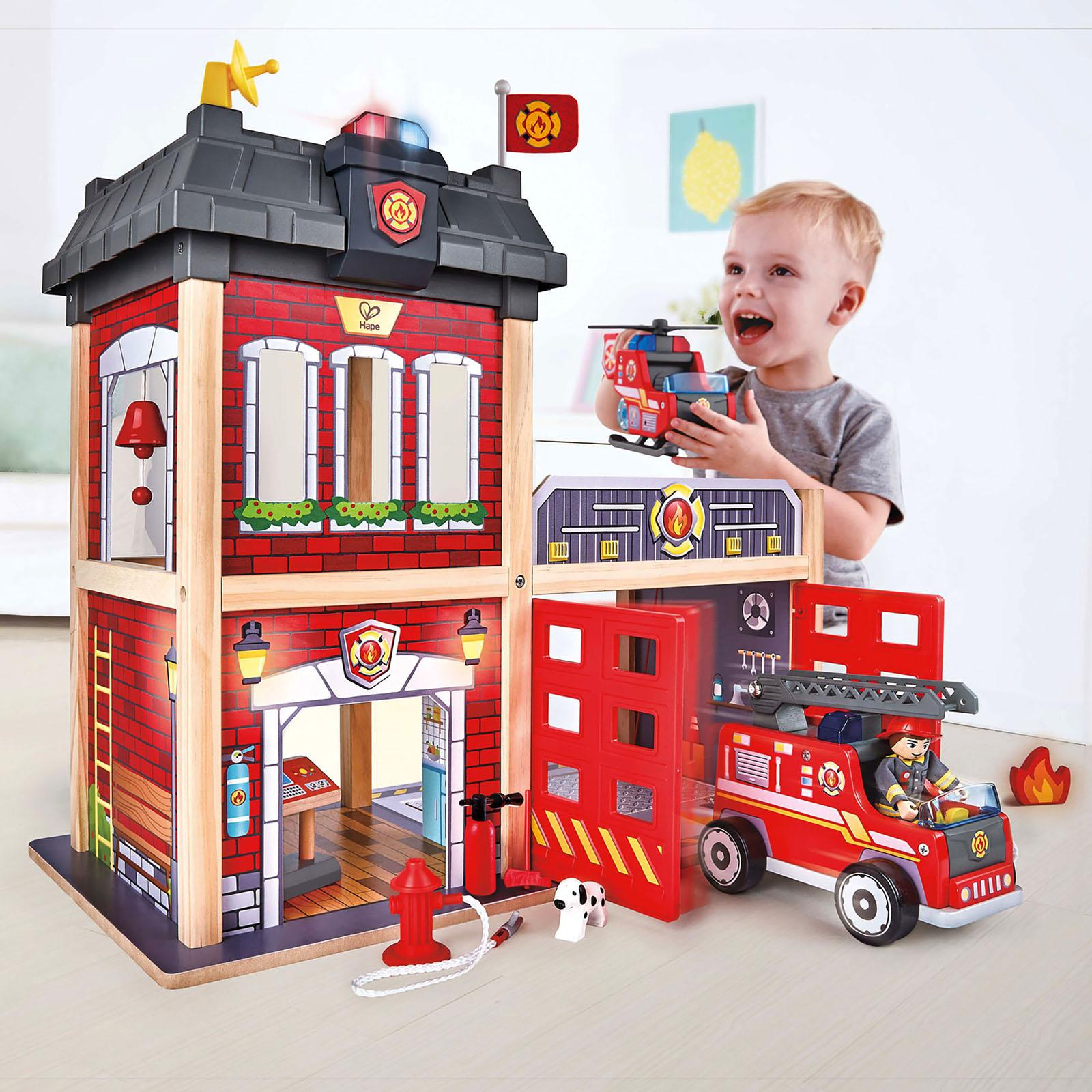 Get ready for a rescue adventure with this fire station play set. Sound and Light effects controlled with a push of a button. Adds more fun to this play set and realism to pretend scenarios. Slide the fireman down the pole and fit him in the truck or helicopter. Everything your firefighter needs to save lives is ready. Pull the string and the fire engine rushes out of the garage. Requires 2 AAA batteries (NOT included). Recommended ages 3 years and up.