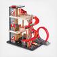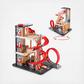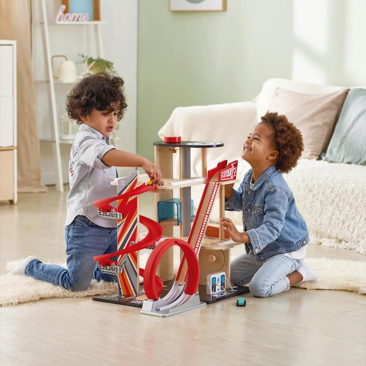Park your cars in the coolest parking garage. Three-level high rise parking lot comes with two free wheeling cars. Place your cars in the elevator turn the knob and get them to upper levels. Navigate your cars down the incredible ramps. Feature two stunt tracks and a spiral ramp. 360-Degree loop track can transform into a launch ramp. Inspire imaginative and pretend play. Made of quality wood construction and non-toxic finishes. Recommended ages 3 years and up.