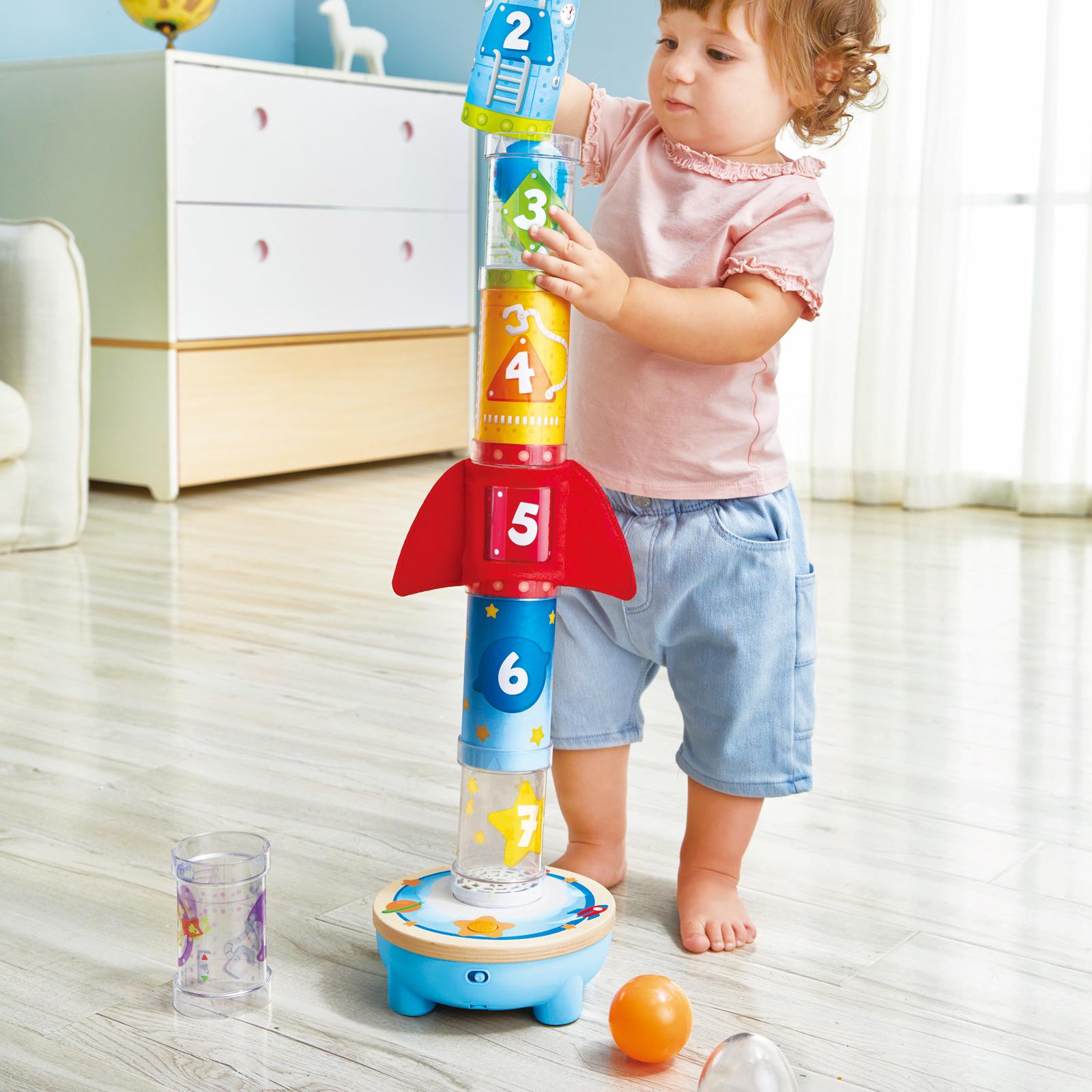 Let your little one watch a ball float into the air. Place the ball in the base stack the tubes and turn on the fan. Stack other tubes and see the ball fly to the top. Fan automatically turns off after 5 minutes of inactivity. Can be stacked up to over 35 in.. Helps promote physical development balance and coordination. Become familiar with aerodynamic physics and adventure. Requires 4 AA batteries (included). Recommended ages 2 years and up.