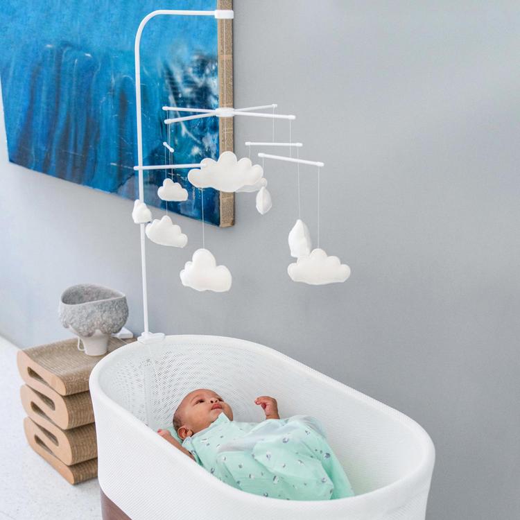 Want your little one to sleep on cloud nine? They will SNOOze even more sweetly with our Sky mobile’s playful clouds dancing above them. And when they wake, your baby will love watching the beautiful sky pattern printed on the underside of each woolen cloud. This special design was created to engage their attention and interest by celebrated pediatrician, Dr. Harvey Karp! Sky securely attaches to SNOO so, over the first 5 months, your lovebug can enjoy the scenery floating by. Once your tot graduates from SNOO, Sky doubles as a timeless piece of nursery décor. Simply detach it from its mount and hang it from the ceiling. For a baby mobile that will delight both you and your baby…reach for Sky!