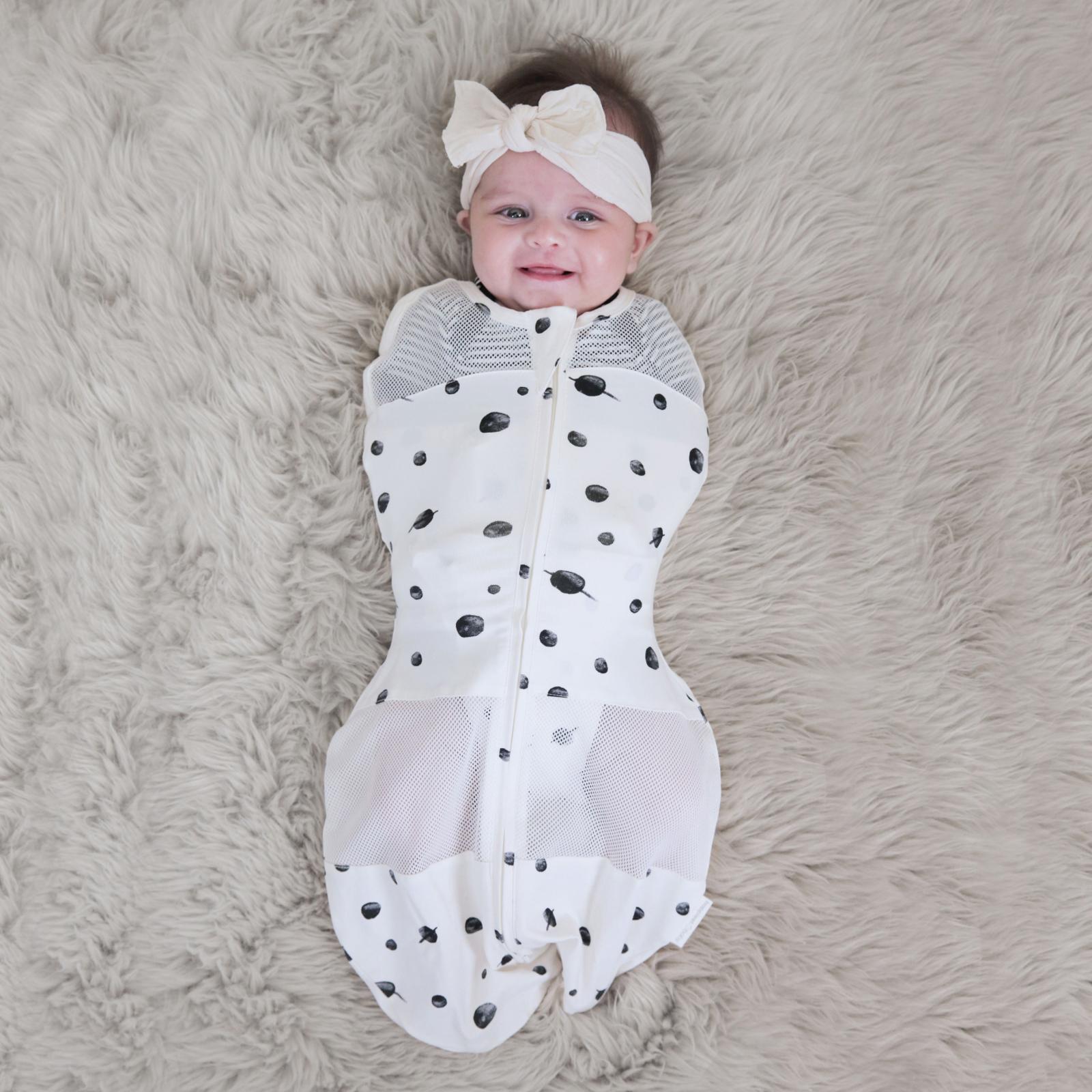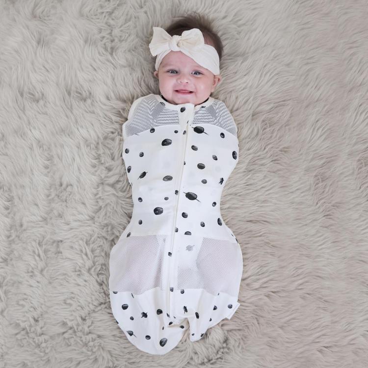 Sleepea is the ultra-soft, simple-to-use swaddle that helps babies sleep longer and happier. Our patented 5-Second Swaddle design makes safely wrapping your lovebug as stress-free as can be! Because Sleepea is made with soft organic cotton and breathable mesh panels, you can rest assured that your little one will not only sleep comfortably all night long (no matter the season), but they’ll snooze safely, too. After all, Sleepea was designed by renowned pediatrician Dr. Harvey Karp, the world’s leading swaddling expert. Sleepea’s inner flaps give babies the womb-like embrace they love while keeping even mini escape artists securely wrapped and preventing the wild arm movements and nose whacks that can startle them awake. And, unlike most baby swaddles, Sleepea allows for safe arms-out swaddling, making it the perfect transitional swaddle for babies that are almost ready to wave bye-bye to their swaddling days. For the first 6 months of life, babies should only sleep on the back. If your baby can roll, you should stop swaddling the arms. That’s because babies need to be able to push up in case they roll to the tummy and the face is pressing against the mattress. (Always consult your baby’s doctor for their advice.)