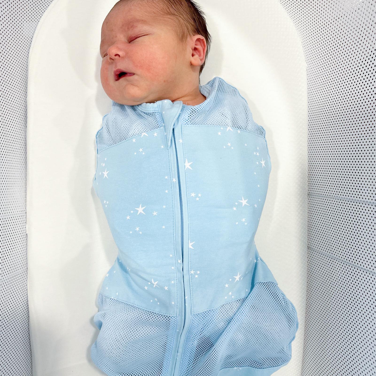 Sleepea is the ultra-soft, simple-to-use swaddle that helps babies sleep longer and happier. Our patented 5-Second Swaddle design makes safely wrapping your lovebug as stress-free as can be! Because Sleepea is made with soft organic cotton and breathable mesh panels, you can rest assured that your little one will not only sleep comfortably all night long (no matter the season), but they’ll snooze safely, too. After all, Sleepea was designed by renowned pediatrician Dr. Harvey Karp, the world’s leading swaddling expert. Sleepea’s inner flaps give babies the womb-like embrace they love while keeping even mini escape artists securely wrapped and preventing the wild arm movements and nose whacks that can startle them awake. And, unlike most baby swaddles, Sleepea allows for safe arms-out swaddling, making it the perfect transitional swaddle for babies that are almost ready to wave bye-bye to their swaddling days. For the first 6 months of life, babies should only sleep on the back. If your baby can roll, you should stop swaddling the arms. That’s because babies need to be able to push up in case they roll to the tummy and the face is pressing against the mattress. (Always consult your baby’s doctor for their advice.)