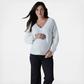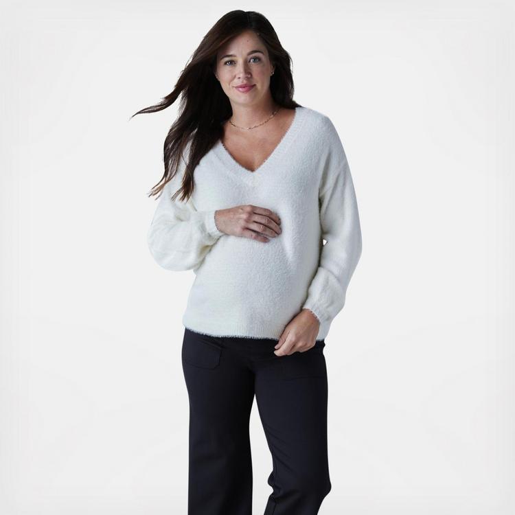 Add some fluff to your capsule wardrobe. This maternity sweater’s got a best-of-both-worlds mentality: fun balloon sleeves and the simple V neckline balance out for a soft statement. The ivory eyelash yarn and the boxy, relaxed fit give a romance-meets-modern vibe. We <3 the bump-ready silhouette to show you’ve still got it-bump or not. She does both and so do you.
