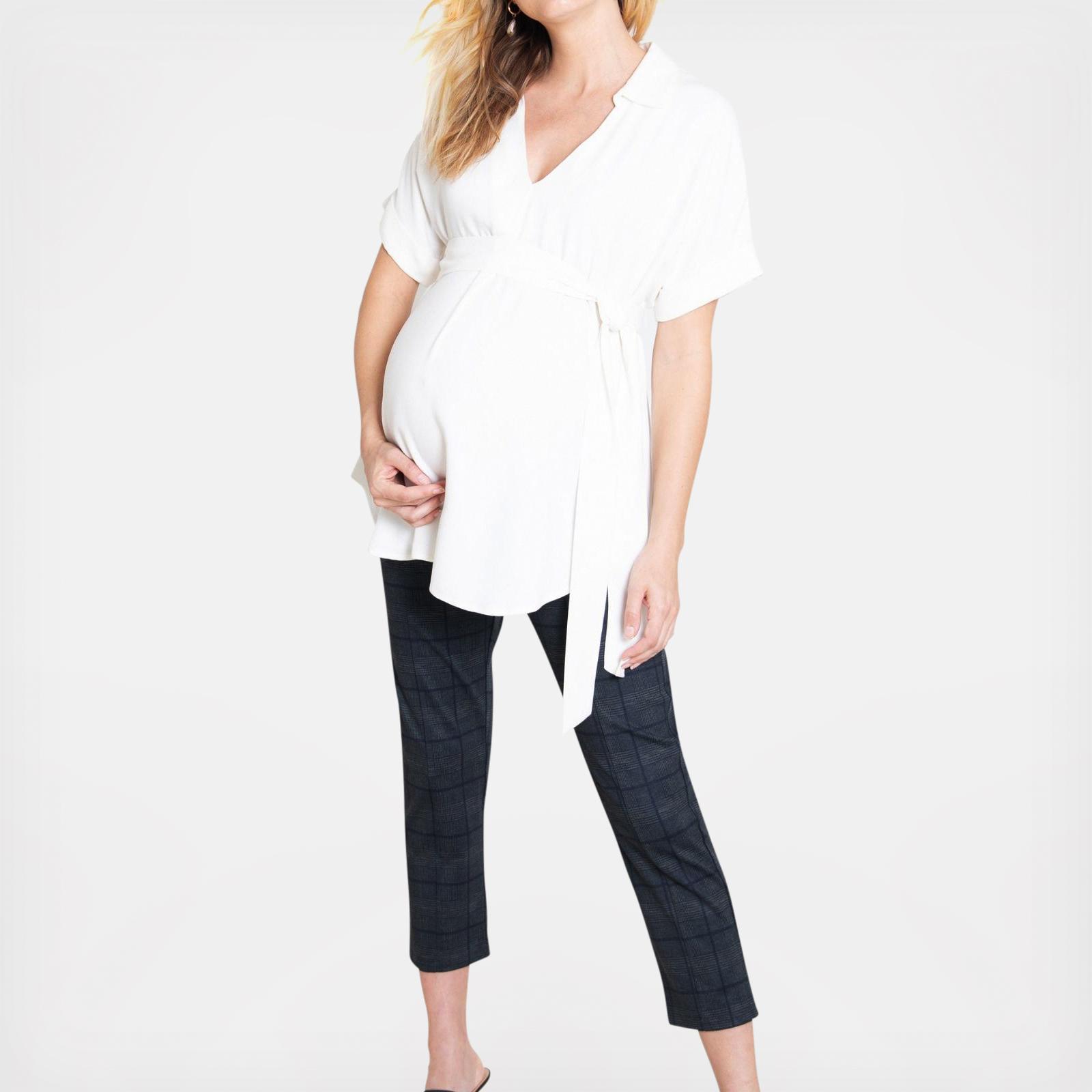 This woven maternity top pulls double duty: Wear it with a blazer and heels for work, or throw it on with jeans or shorts for a weekend look. The cuffed kimono sleeves are ultra flattering and you can adjust the removable tie waist to accentuate your bump at any size.