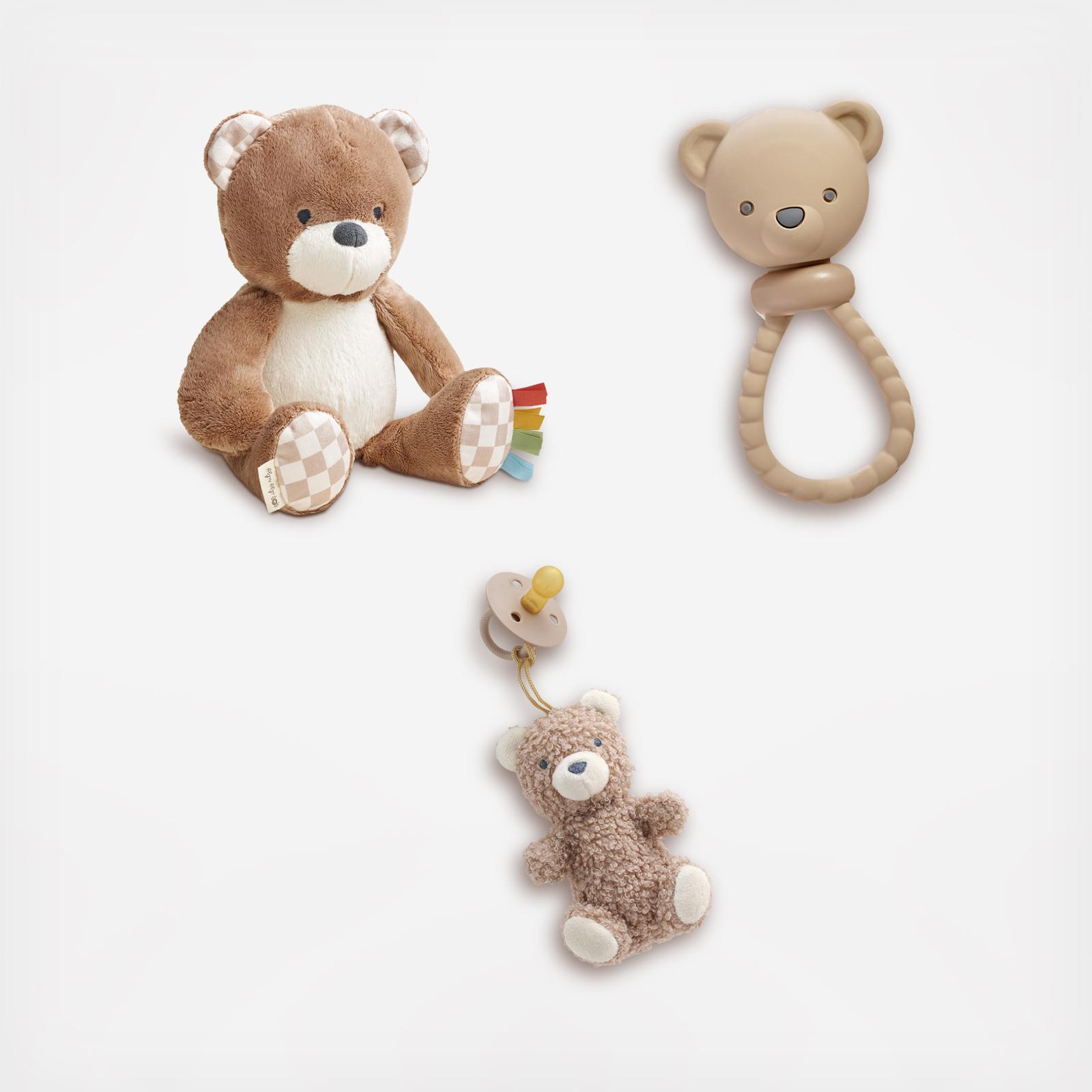 Our iconic characters of the Snuggleverse brought to life in a soft, cuddly plush. Features multiple soft fabric textures and ribbons for sensory exploration and promotes self-soothing. Shake, Rattle & Teethe! Shake off those teething blues with the Sweetie Rattle™ silicone teether. Made of soft, flexible silicone, this engaging rattle features multiple textures to soothe sore gums along with gentle rattle sounds to teach cause-and-effect. Soothe & Snuggle! An elevated duo: meet the Bitzy Pal™, your baby’s new bestie & self-soother all-in-one! This playful plush lovey is beautifully crafted with soft Sherpa & complemented by a pacifier featuring a natural rubber nipple.