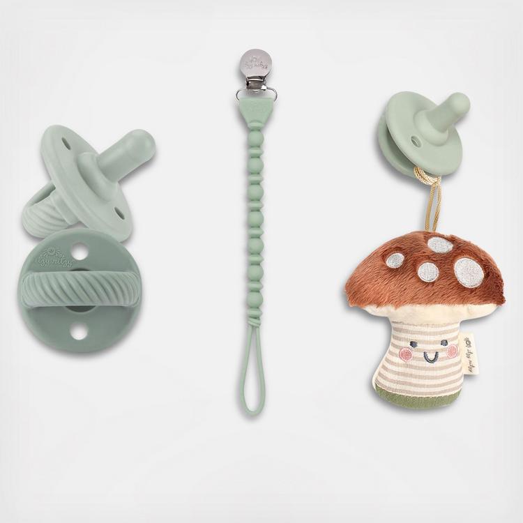Help soothe your sweetie in style with this adorable bundle. The Mushroom Pacifier Bundle precious pacifiers feature a one-piece design made of food grade silicone. Available in a two-pack, this set includes coordinating pacifiers and features a precious bow accent. Say goodbye to lost pacifiers. Sweetie Strap™ and keeps pacifiers in place while also looking stylish with its beaded pattern. The secure clasp is gentle on clothes, and the silicone cord is easy to attach to almost any pacifier, teether or small toy. A sweet unicorn pal and pacifier all in one. The Sweetie Pal™ lovey attaches to our Sweetie Soother™ pacifier and is easy for baby to grasp while keeping the pacifier in place. The soft is detachable, machine washable and will become an instant BFF for your little one.