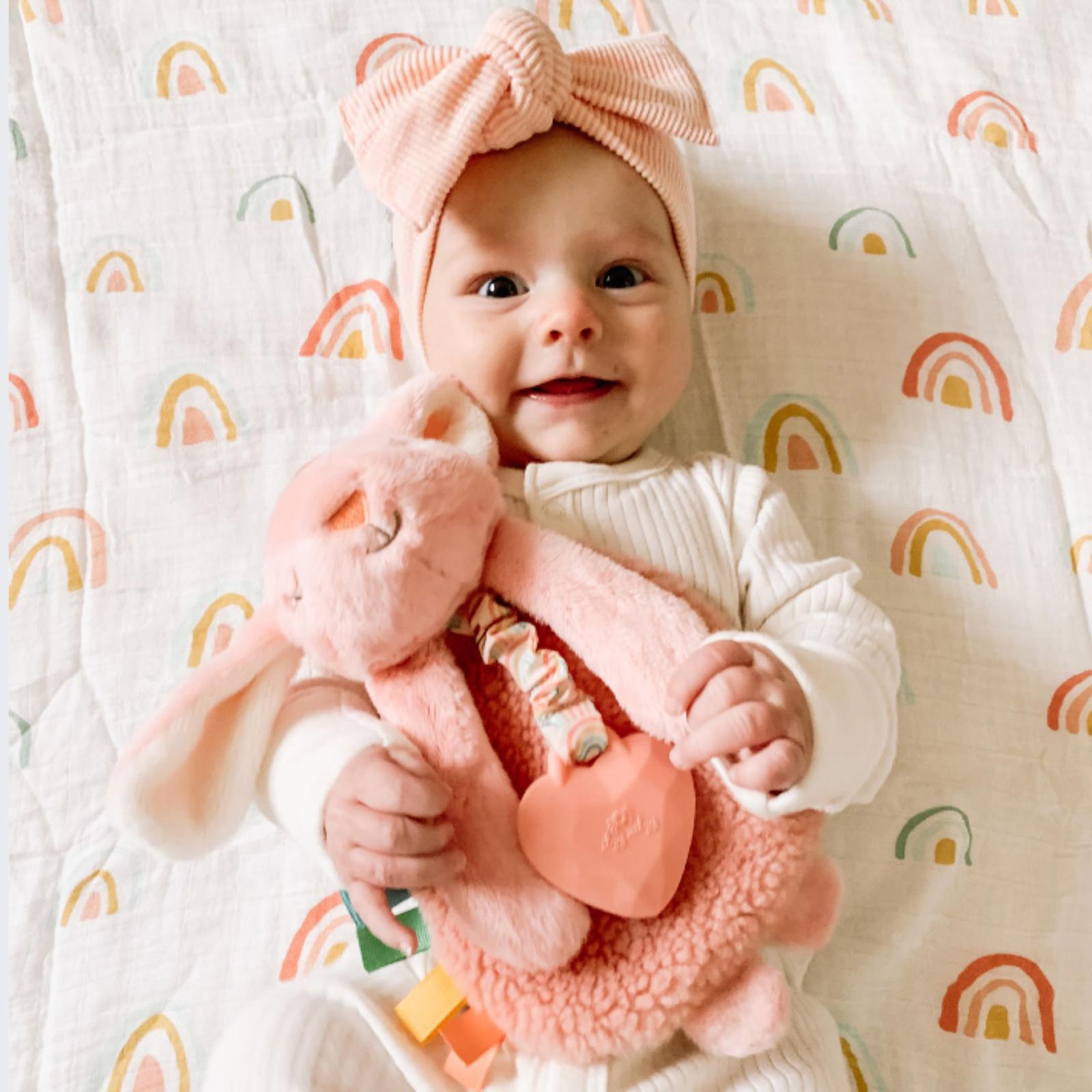 Cuddle & Bond. These snuggly Lovey features soft sherpa fabric and textured ribbons that baby will love to explore. A textured teether helps massage and soothe sore gums, and crinkly arms are sure to keep baby entertained with their gentle sound.