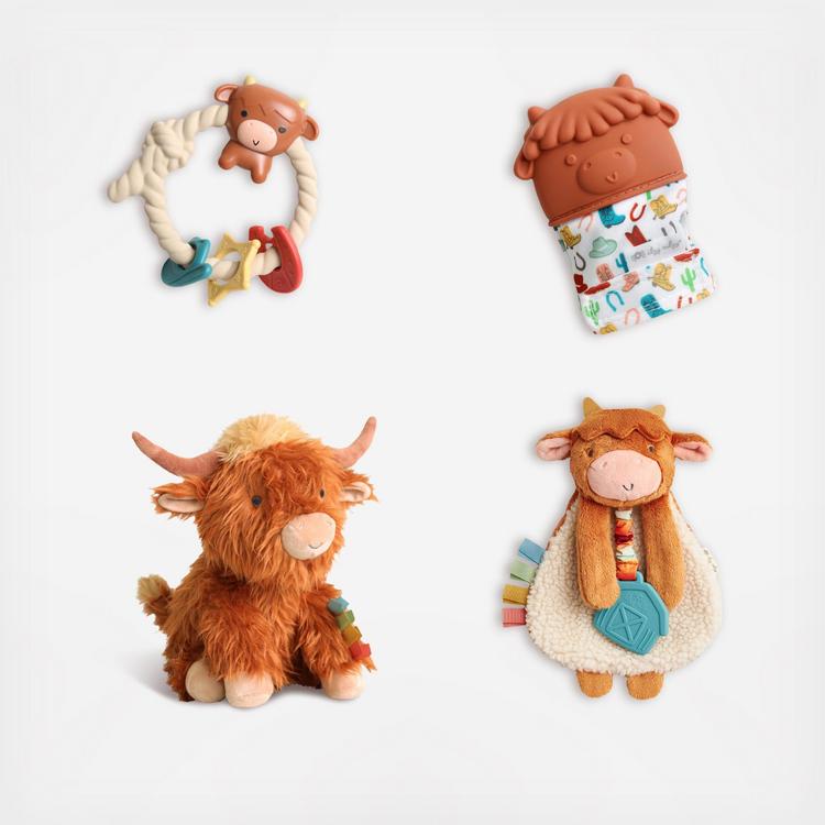 Ritzy Rattle™Shake the teething blues away with an adorable Ritzy Rattle®! Our silicone rattle teether features a gentle rattle sound and includes shaped rings to keep baby’s hands busy. Itzy Mitt™Our modern teething mitt is worn like a glove, making it perfect for babies who can’t yet hold a teether. Sweetie Snuggles™ Our iconic character, Wyatt the Highland Cow, brought to life in a soft, cuddly plush. Features multiple soft fabric textures and ribbons for sensory exploration and promotes self-soothing. ITZY LOVEY™ Wyatt the Highland Cow! Our snuggly Itzy Lovey™ features soft Sherpa fabric and textured ribbons that baby will loveto explore! A textured silicone teether helps massage and soothe sore gums, and crinkly arms and legs are sure to keep baby entertained with their gentle sound!