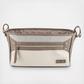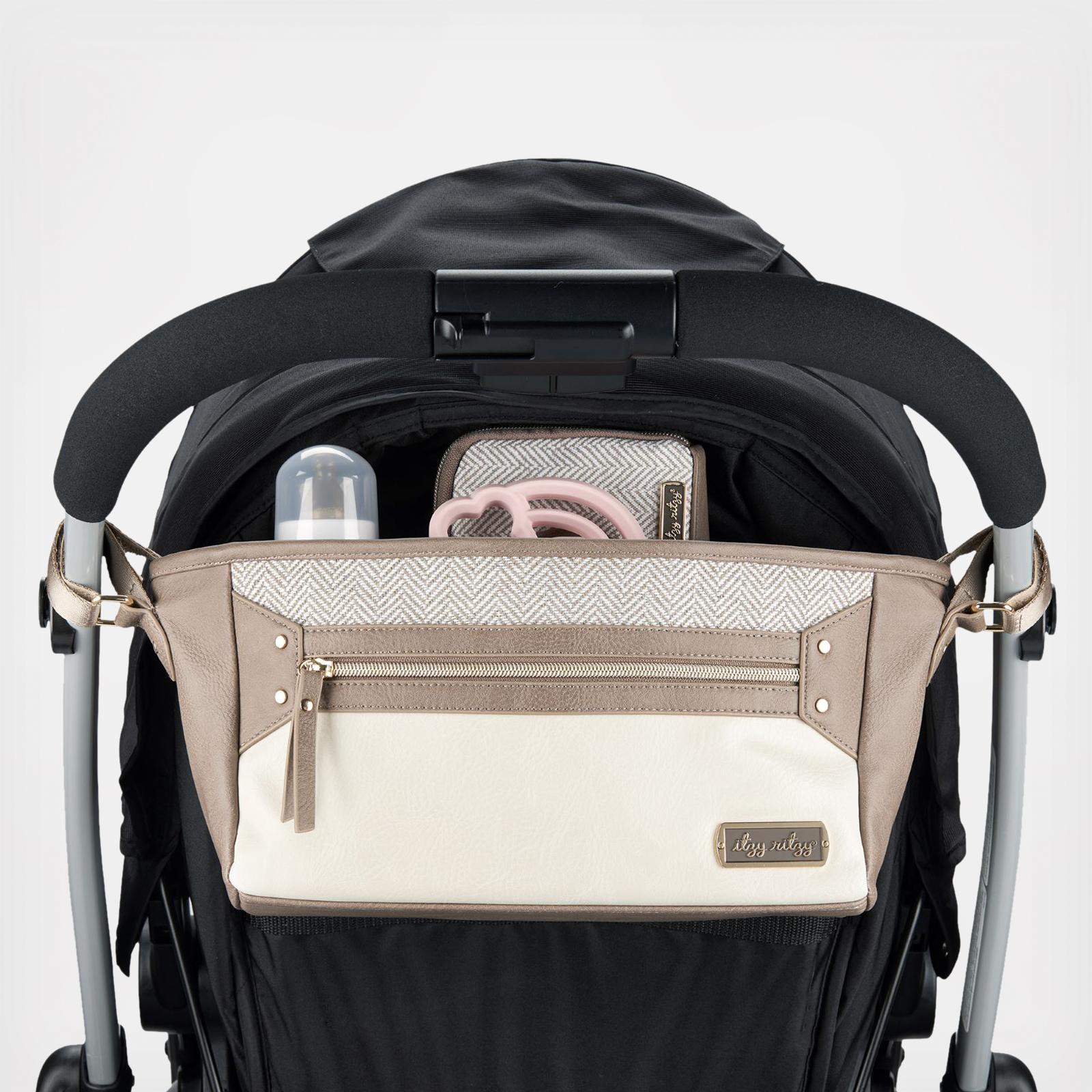 Stay organized while on the go. Stroller caddy is as practical as it is sleek. It features adjustable straps that can accommodate almost any size of stroller handle, and they allow the caddy to be repositioned and moved whenever you choose. The exterior of the caddy features a zippered front pocket that can store phones, keys and other parent essentials while the interior of the caddy includes two built-in pockets to hold bottles along with a roomy middle pocket. The stroller caddy making it the perfect addition to any stroller.