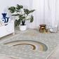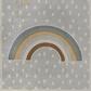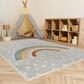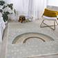This cheerful rug features a minimalist sun and rainbow on a background of abstract raindrops. The washable, kid-friendly pattern is perfect for a bedroom, playroom, home office or family room. Made from pet-friendly synthetic fibers. This rug is easy to clean.