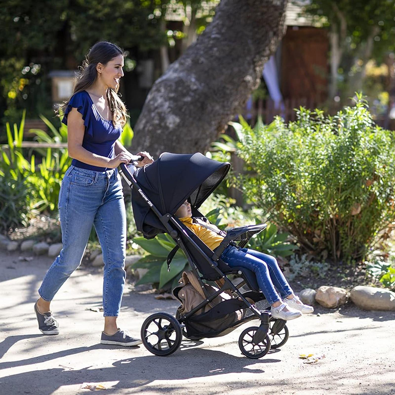 We adore travel strollers because they’re lightweight and compact. The Kooper RS is no exception. But what we love about this stroller is its maneuverability. Designed with large 9 in. rear and 7 in. front wheels, the push is smooth, weightless, and dare we say – enjoyable!