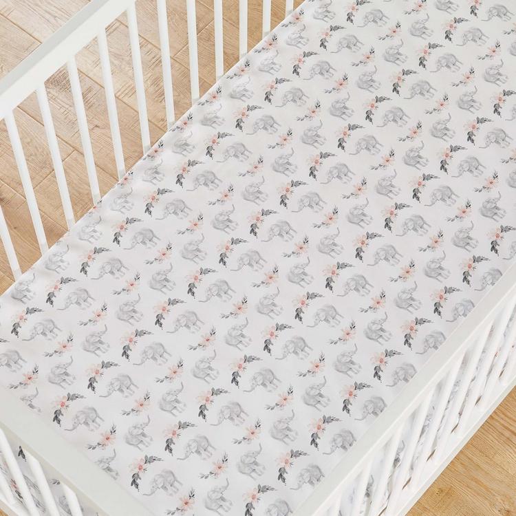 Your baby will rest peacefully on the Baby Heritage Elephant Fitted Crib Sheet. This fitted sheet is covered in rows of elephants and beautiful flowers on a ground. This cotton fitted sheet is gentle on your baby's soft skin and features elastic edges so that it fits snuggly around a standard-size crib mattress, staying in place until you remove it for cleaning. This sheet will transform your nursery, adding fun and elegant accents. Enjoy for years to come.
