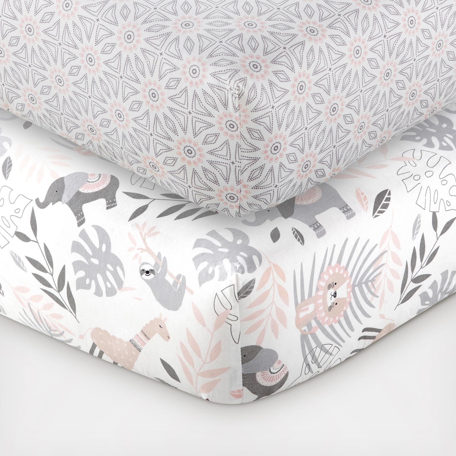 Your baby will rest peacefully on the Baby Imani 2-Piece Fitted Crib Sheet. One fitted sheet is covered in graphic medallion on a ground and the other is tossed llamas, elephants, lions, leaves and sloths on a gorund. These fitted sheets are gentle on your baby's soft skin and features elastic edges so that it fits snuggly around a standard-size crib mattress, staying in place until you remove it for cleaning. These sheets will transform your nursery, adding accents. Enjoy for years to come.