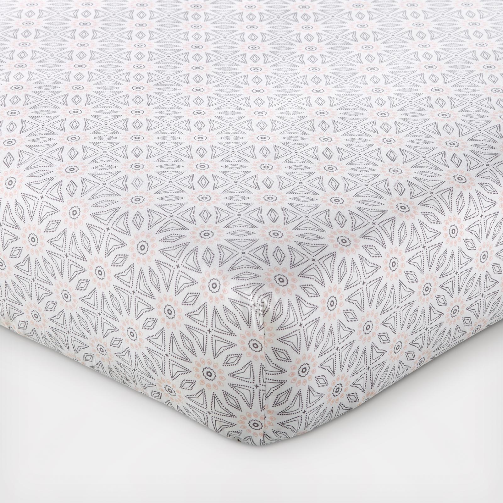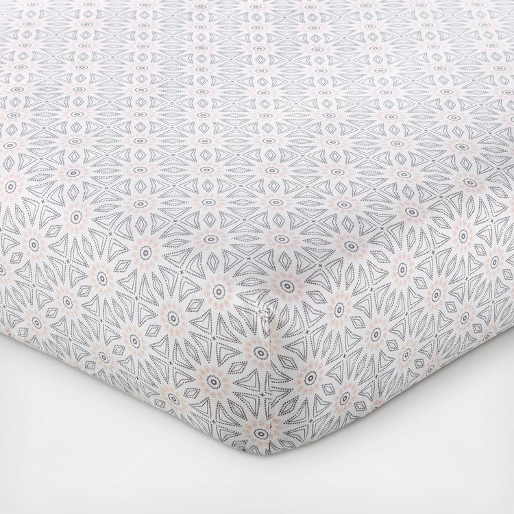 Your baby will rest peacefully on the Baby Imani Fitted Crib Sheet. This fitted sheet is covered in graphic medallions on a ground. This cotton fitted sheet is gentle on your baby's soft skin and features elastic edges so that it fits snuggly around a standard-size crib mattress, staying in place until you remove it for cleaning. This sheet will transform your nursery, adding fun and adventurous accents. Enjoy for years to come.