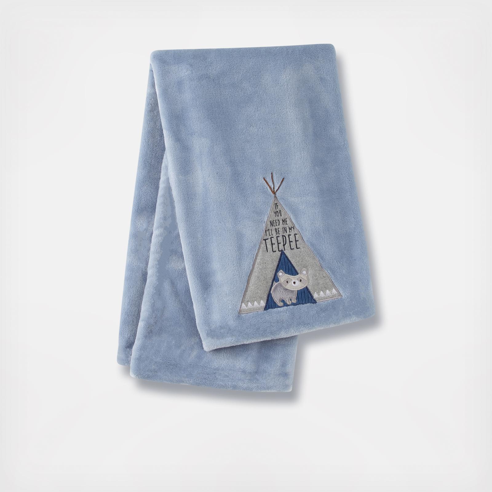 Wrap your baby up in warmth and comfort with the Baby Trail Mix Blanket. Made of an adorable soft plush fabric, this blanket features an appliqued and embroidered racoon inside a teepee with a cute phrase above, on a soft plush all around.