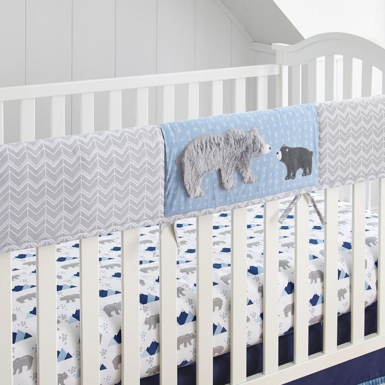 The Baby Trail Mix Rail Guard features a momma bear and her cub appliqued and embroidered on a light ground joined to a handsome zig zag print. Keep your baby safe in this fun, decorative rail guard for years to come.
