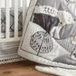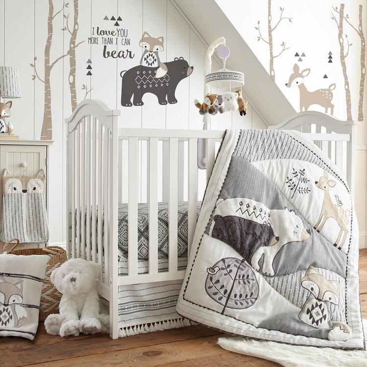 The Bailey nursery set is 100% cotton (not including decoration) and features 5 beautifully coordinated and complementary pieces, consisting of a quilt, a 100% cotton fitted sheet, a dust ruffle with decorative tassels, a diaper stacker and a large decorative wall decal. The grey, taupe and charcoal color palette of the Bailey crib set is gender neutral and will fit with any nursery décor for either boys or girls, making this bedding set, or any of the nursery accessories that coordinate with it, the perfect baby shower gift or accent for a new nursery.