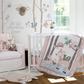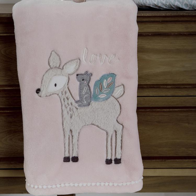 A beautiful accessory for any baby nursery, the Everly plush blanket features a soft pink plush blanket with an appliqued and embroidered deer carrying her little squirrel friend and the words LOVE embroidered above them. This is the perfect blanket to snuggle with, use as a stroller blanket or just lay on during tummy time. The color palette of the Everly blanket makes this, or any of the nursery accessories that coordinate with the Levtex collection, the perfect baby shower gift or accent for a new nursery.