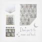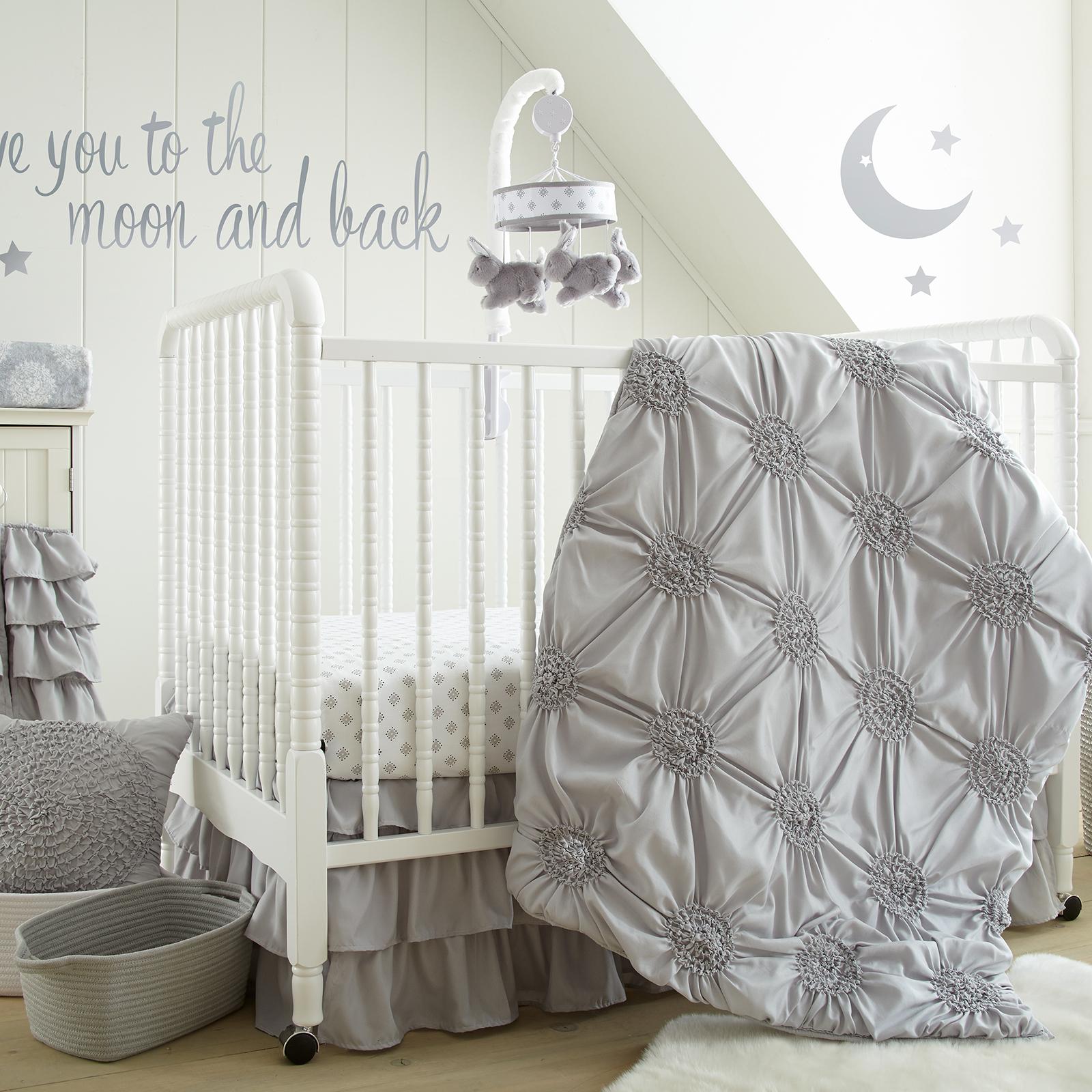 The Willow nursery set is 100% brushed microfiber and features 5 beautifully coordinated and complementary pieces, consisting of a quilt, a 100% cotton fitted sheet, a tiered, ruffled bed skirt, a tiered diaper stacker and a large decorative wall decal. The color palette of the Willow crib set is gender neutral and will fit with any nursery décor for either boys or girls, making this bedding set, or any of the nursery accessories that coordinate with it, the perfect baby shower gift or accent for a new nursery.