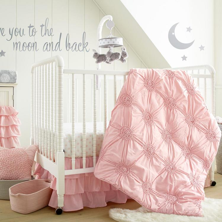 The Willow nursery set is 100% brushed microfiber and features 5 beautifully coordinated and complementary pieces, consisting of a quilt, a 100% cotton fitted sheet, a tiered, ruffled bed skirt, a tiered diaper stacker and a large decorative wall decal. The color palette of the Willow crib set is gender neutral and will fit with any nursery décor for either boys or girls, making this bedding set, or any of the nursery accessories that coordinate with it, the perfect baby shower gift or accent for a new nursery.