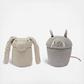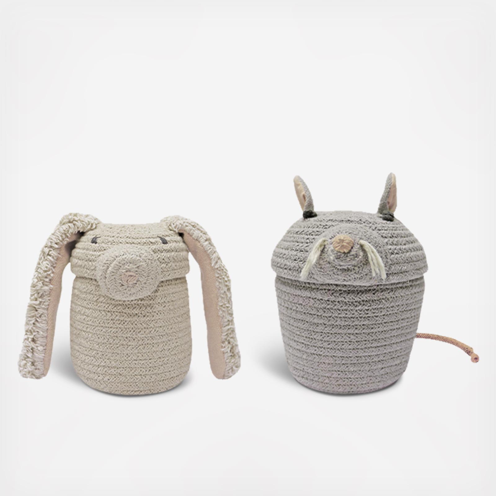 A set of two mini versions of our popular Rita the Rabbit basket and Renata the Rat! The baskets are carefully handcrafted using a braided cotton ropes in Natural and Pearl Grey colors respectively, with added details in cotton canvas. A set of twp practical sized baskets to fit on your shelf and keep your little treasures in order.