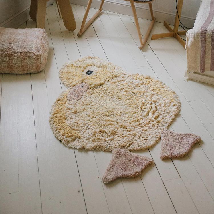 Add a touch of quack to any space with the Ducky animal rug! A charming, fluffy little rug that will light up your room! Shaped as a baby duck and tufted in soft yellow hues, combining short and high piles to illustrate the rounded shape of the animal. The Ducky animal rug has a rose-colored beak and paws with fluffy piles both on the front and the reverse side.