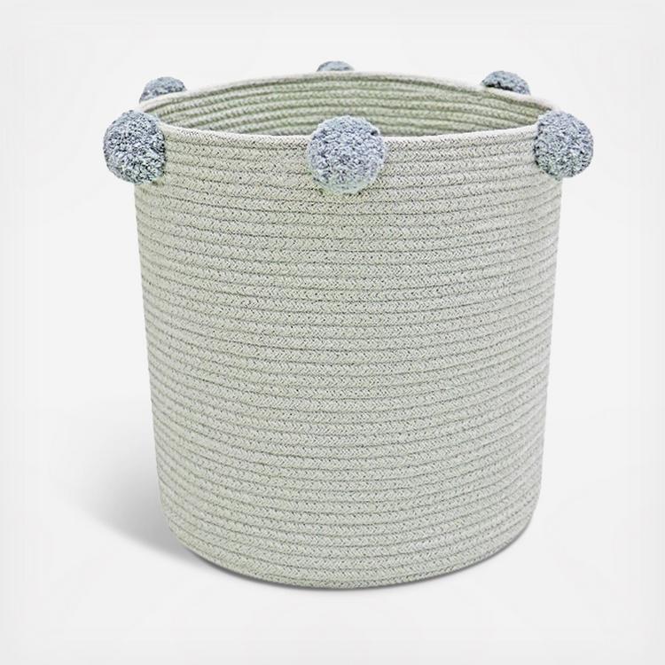 This is a unique artisan piece, carefully designed by Lorena Canals and sustainably handcrafted in own factory using natural fibers and upcycled materials, non-toxic dyes, and a firm commitment to the planet and people. From the design process, to material sourcing and production, we always choose options that minimize waste and ensure long-lasting designs. Braided cotton basket with circular base, in blue sage color.