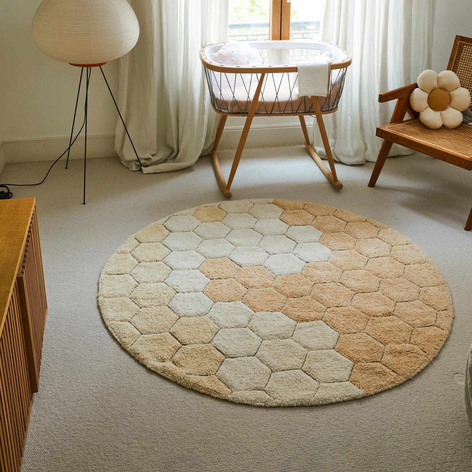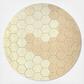 Inspired by the geometric honeycomb pattern, the Round Honeycomb rug is made of soft tufted hexagonal color patches in shades of many colors. The base canvas is slightly visible in between the color patches, giviing a structured surface to the rug.