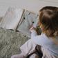 A charming textile book with Fred the Frog and his friends. This interactive book invites children to explore textures, colors, and shapes while learning about their favorite animals. This sensorial book features our popular Animal Crew with fun details in 3D. It is made by upcycling textile scraps from our own factory making it a sustainable choice for your kids decor. ¡Find out who is hiding beneath the long ears!