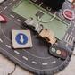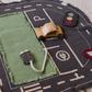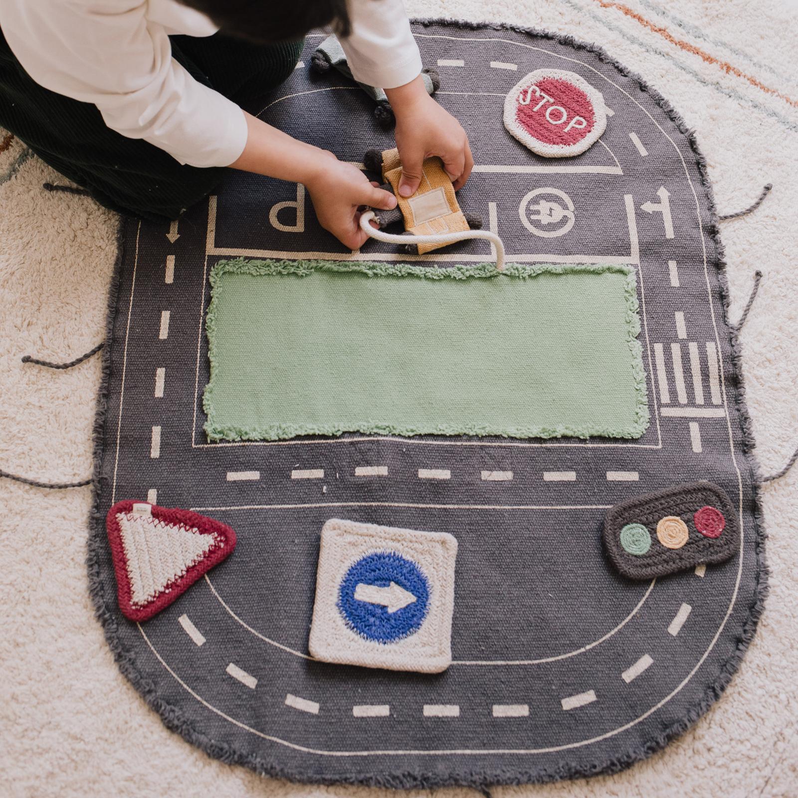 Charge your car and go! A textile playset that stimulates imagination and interactive play. This dark gray canvas comes with handcrafted accessories: a traffic light, a stop sign, a yield sign, an arrow sign, a car charger and two cars. It also has a printed road, crossroad and a parking lot. This base easily folds and ties up, converting it into a convenient briefcase while keeping the accessories inside for easy-to-carry playtime! It is made by upcycling textile scraps from our own factory making it a sustainable choice for your kids toys. The toy set comes packed in a house shaped recycled cardboard box with a cord handle.