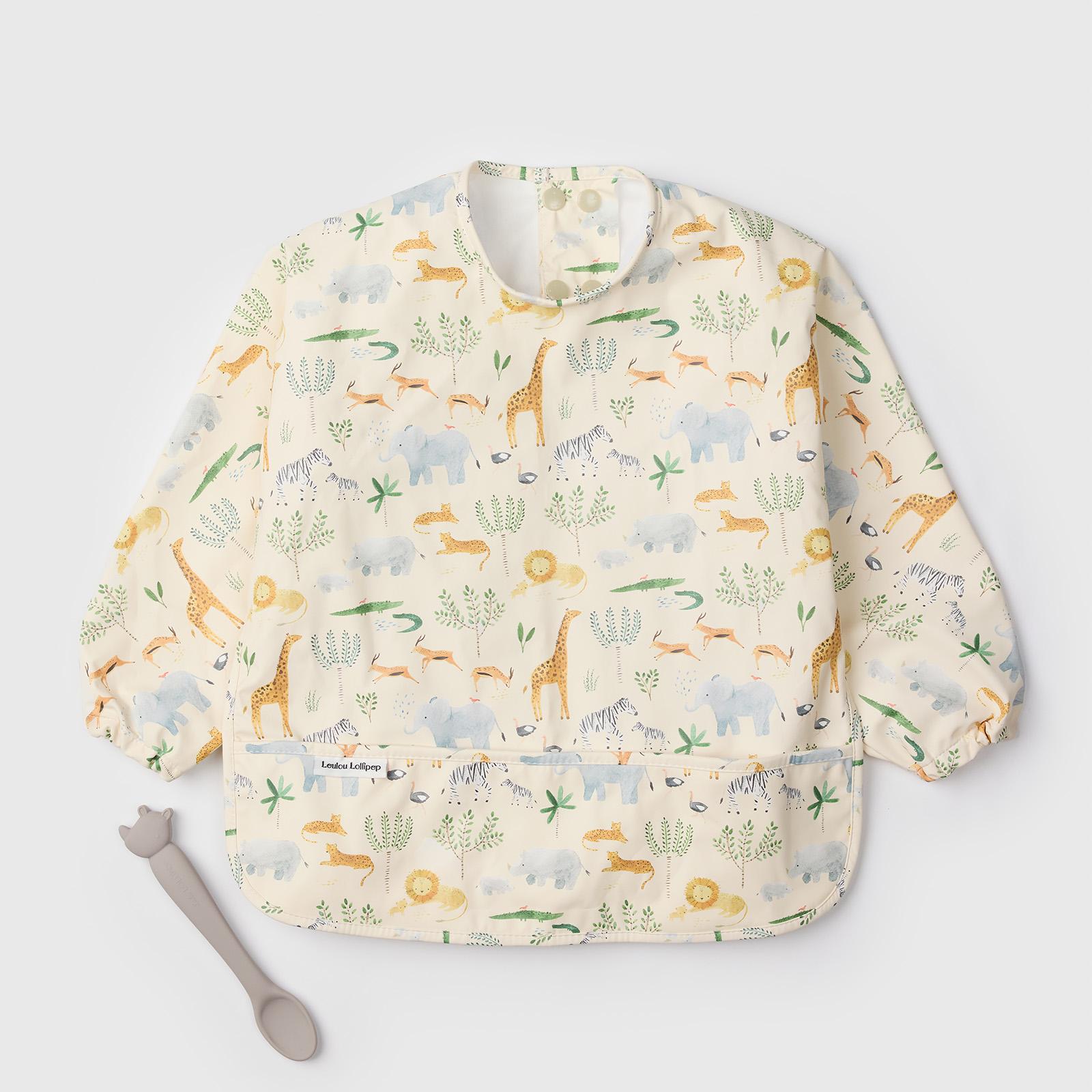 Make mealtime and playtime mess-free with this practical and adorable bundle! It features our Long Sleeve Bib in the playful Jungle Friends print, offering full-coverage protection from spills and stains, and a charming feeding spoon crafted from LFGB-certified, highest-standard silicone. The bib, made from recycled polyester, is lightweight, waterproof, and easy to clean, while the ultra-safe silicone spoon is gentle on gums and perfect for little hands. Together, they create the ultimate duo for stress-free meals and creative adventures!