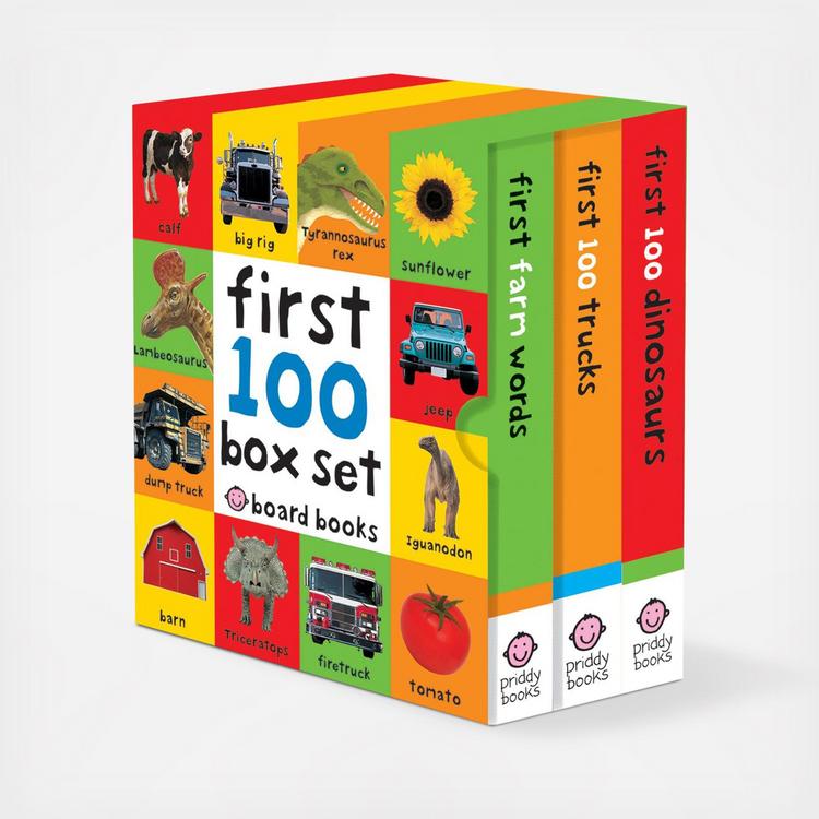 Priddy Books' First 100 Box Set includes three bestselling titles from the successful First 100 series, stored in a sturdy slipcase. Roger Priddy's First 100 Box Set includes three bestselling first word titles to read and learn. The small, easy-to-hold size, is an ideal size for little hands.
