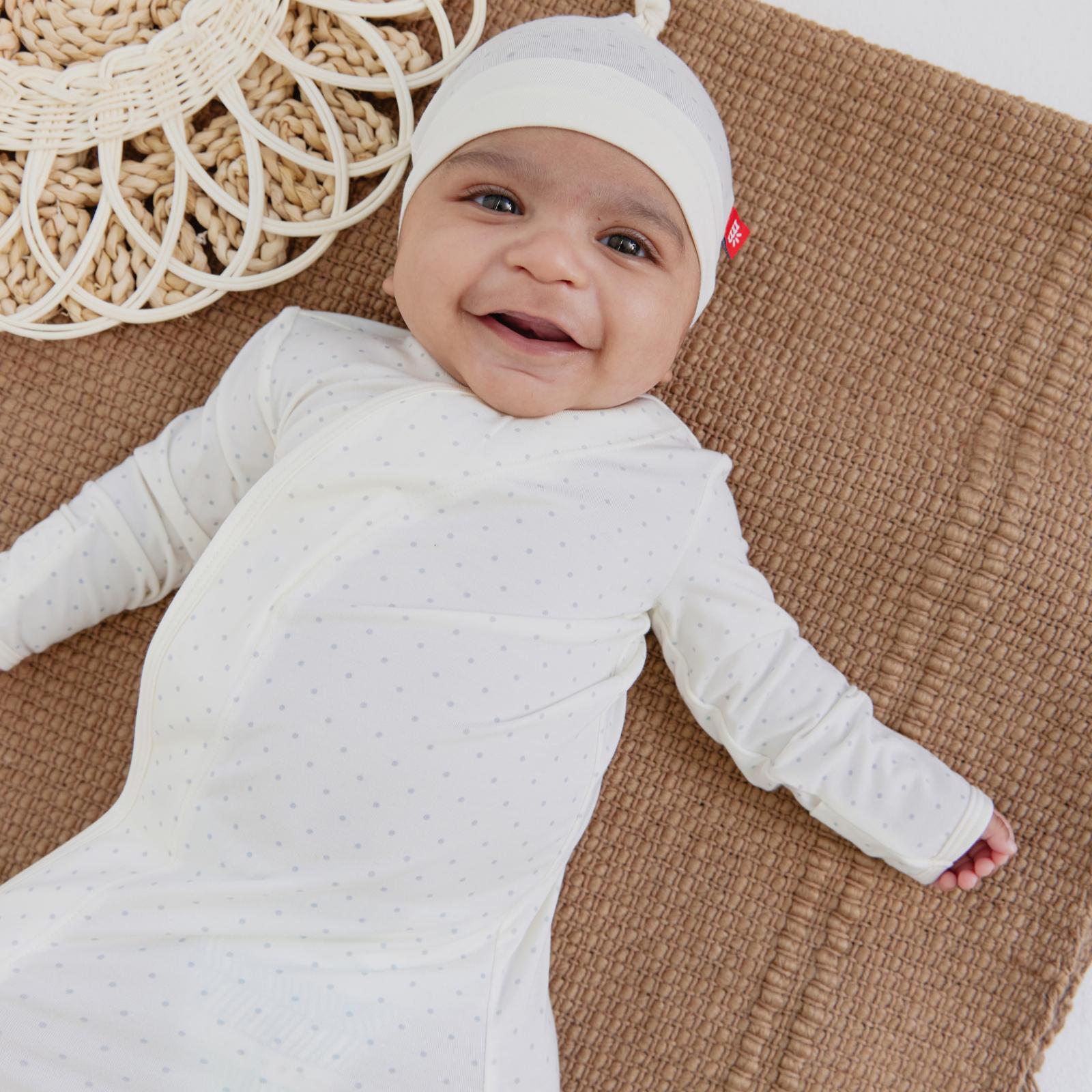 The cozy sleeper gown + hat set is a wardrobe staple for newborns who require constant diaper changes (aka all of them). with magnets down the front, baby stays in the gown during the diaper switcheroo: separate magnets, put on a freshy, click magnets, done. other amazing features: eco-friendly TENCEL™ modal fabric and built-in mitten cuffs.