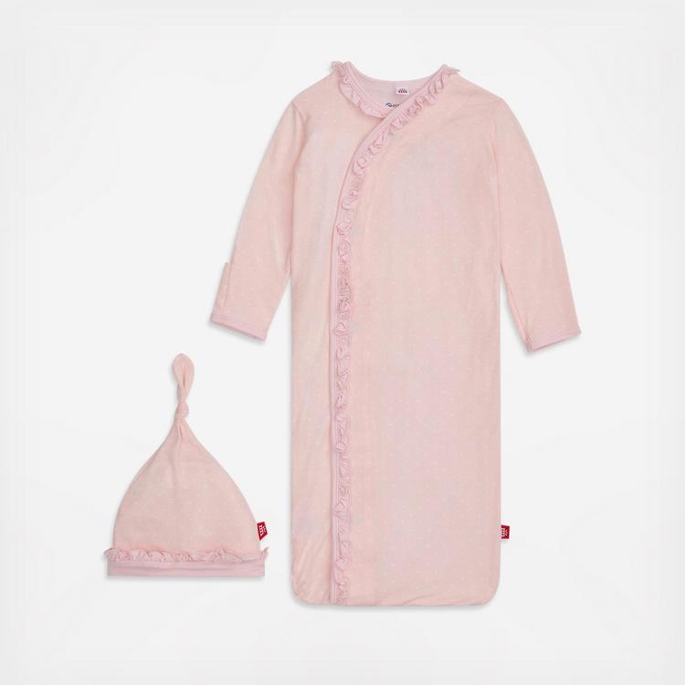 The cozy sleeper gown + hat set is a wardrobe staple for newborns who require constant diaper changes (aka all of them). with magnets down the front, baby stays in the gown during the diaper switcheroo: separate magnets, put on a freshy, click magnets, done. other amazing features: eco-friendly TENCEL™ modal fabric and built-in mitten cuffs.
