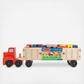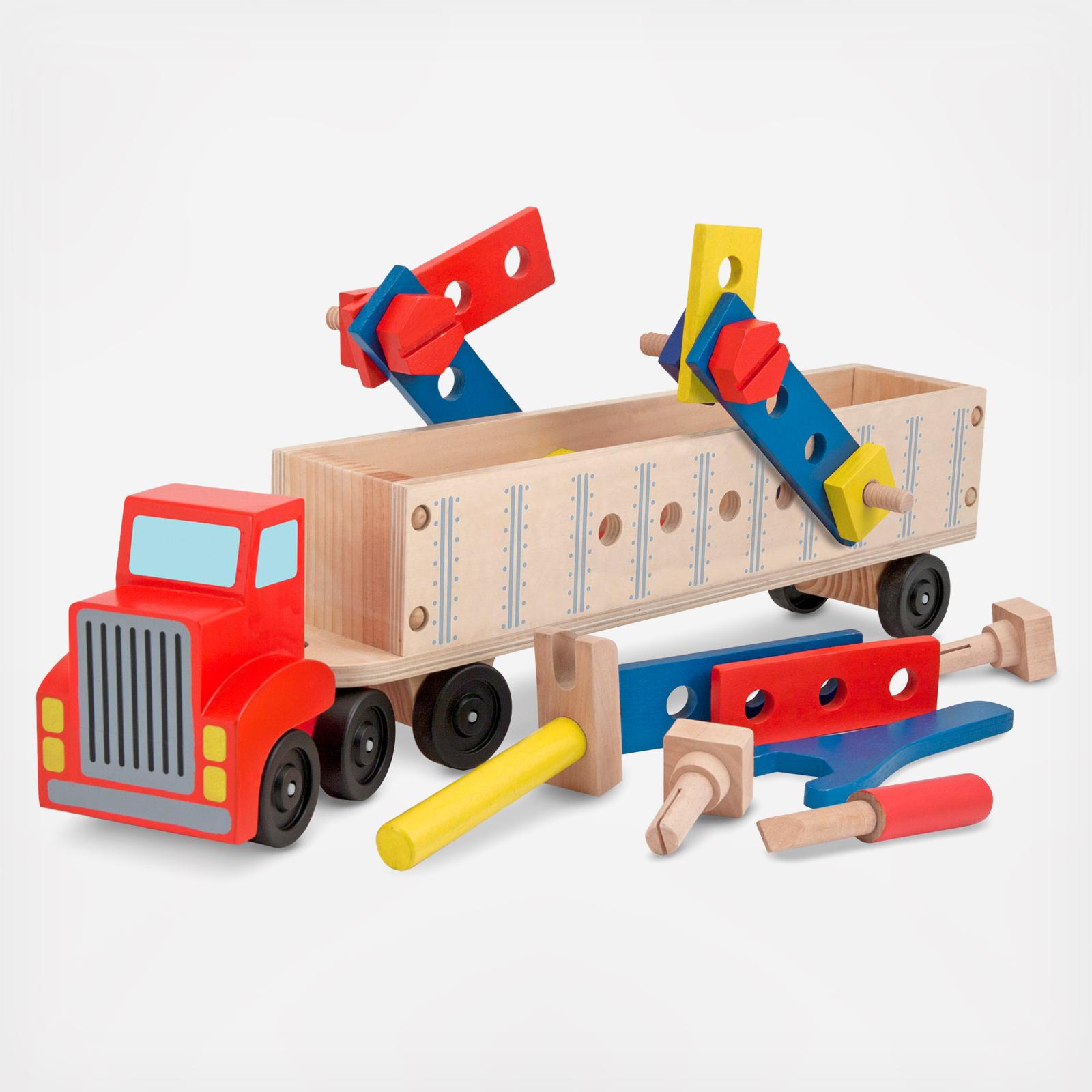 This tough, two-piece tractor-trailer is ready to roll and ready to build! Packed with wooden construction pieces and pre-drilled with holes for the wooden nails and bolts, the truck itself is a moving building site. Connect the painted building boards to create brightly colored structures on wheels! The building toy's 22 wooden toy pieces - including a hammer, screwdriver, wrench, board, nails, nuts, and bolts - store away inside the trailer to keep your little builder's supplies organized for the next big job. Big Rig Building Set wooden truck toy is great for fine motor skills, hand-eye coordination, and problem solving, and encourages imaginative play and manual dexterity.