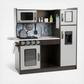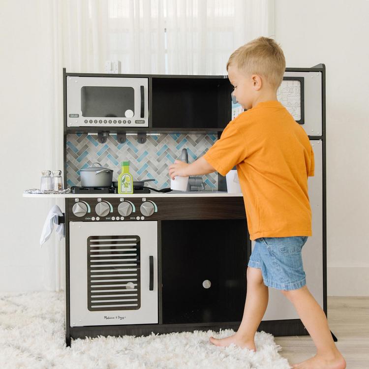 Budding young chefs can hone their craft in this beautifully designed, modern play kitchen! The easy to assemble chef's kitchen includes a refrigerator/freezer with innovative working ice maker that dispenses two included "ice cubes," an oven and stovetop with dials that turn, microwave with turning plate, sink with moving faucet and handle, grocery check list, movable hooks, and ample shelving and storage for easy cleanup. Detailed, illustrated instructions make this kitchen simple to put together. Assembled, it stands approximately 3.5 feet (1 meter) long and more than three feet (0.9 meters) high, roomy enough for multiple kids to play at once. Sturdy, top-quality wooden construction means it will stand up to years of creative make-believe meal-making! This product is certified by the Forest Stewardship Council. FSC certification ensures that products come from responsibly managed forests that provide environmental, social, and economic benefits, and that forests are protected for future generations.