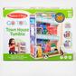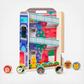 Let’s go play with friends that are fun to roll, stack, and grasp! Six double-sided chunky wooden GO Tots disks tumble and twirl down ramps on the sturdy wooden town house with built-in carrying handle, transitioning from front to back of the building, and coming to rest in their beds. Drop in the top and they zigzag down the side fire escape and pop out the hatch at the bottom!
