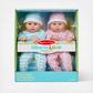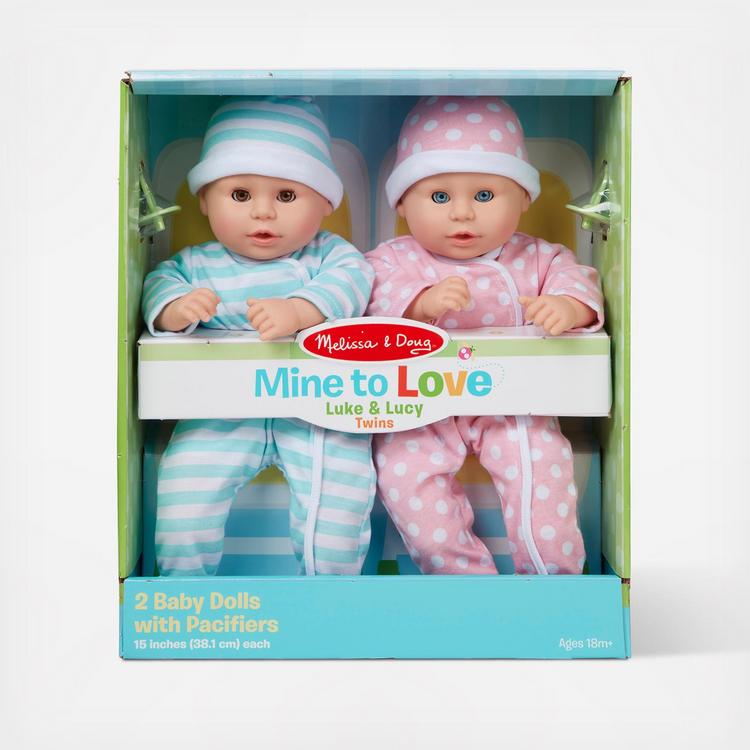It's twice the fun with twin 15-inch dolls Luke and Lucy! They have adorable coordinating removable rompers and caps, eyes that open and close, and they can suck their thumbs or the included pacifiers. Just right for kids 18 months and older, their soft, huggable bodies are lightly scented, with wipe-clean, light skin-tone faces and limbs. Mine to Love dolls and accessories encourage empathy and help kids express themselves as they explore grown-up roles and responsibilities. A child's confidence and self-esteem blossom and grow with each nurturing moment of imaginative play. Luke and Lucy are just waiting for a child to call them "Mine to Love"!