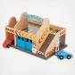 Includes car wash with roller and drying strips, numbered parking area, gas pump, garage with doors, elevator, and two painted wooden cars