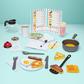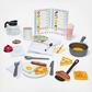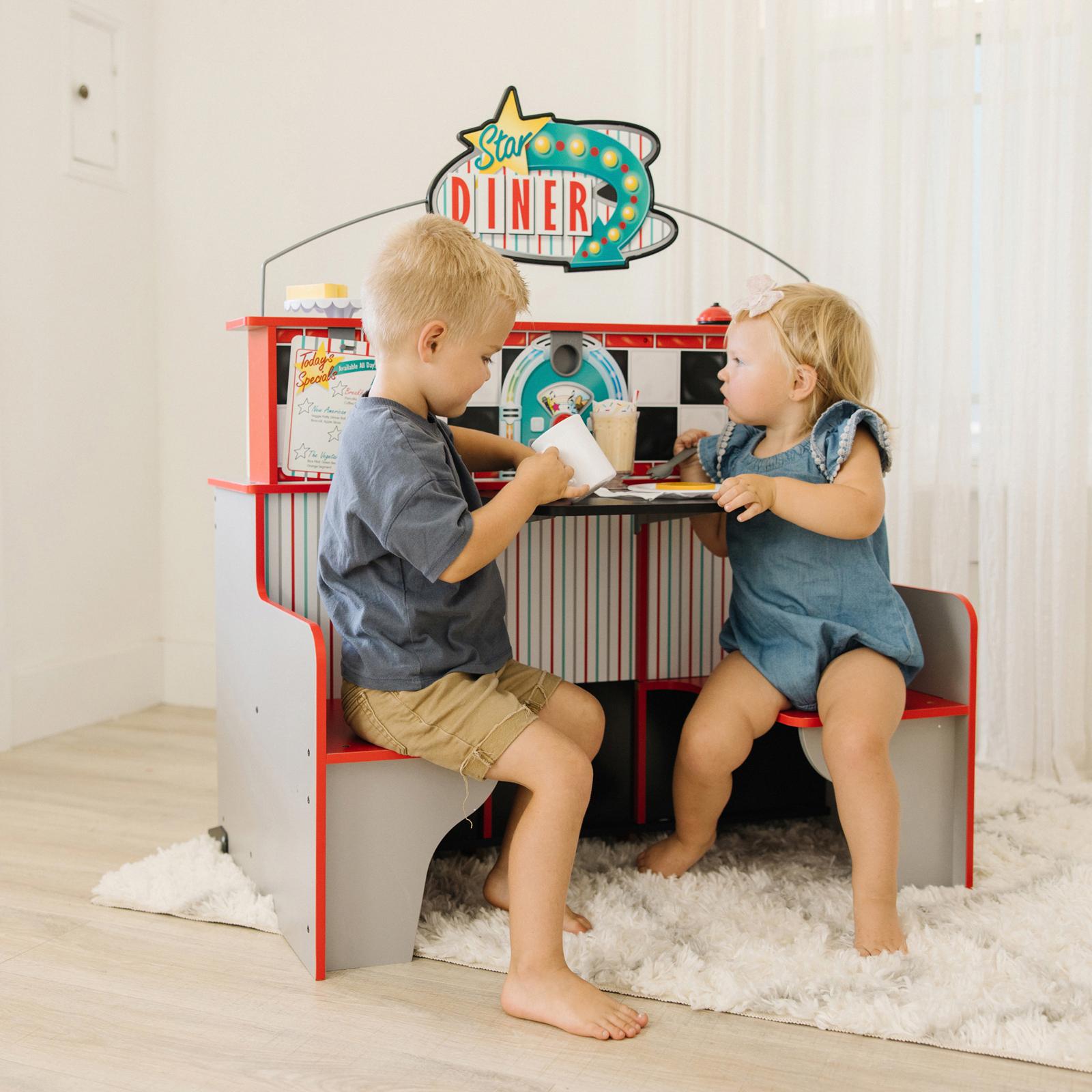 Order up! Everything kids need to serve up delicious diner classics is included in this 41-piece restaurant play set collection. Order on the reusable menu, cook with the durable plastic frying pan and spatula, and serve using a full place setting. Seven wooden food pieces have different food options on either side, and there are even double-sided milkshake and hot drink inserts. Servers and chefs can wear the apron and ring the bell when meals are ready, and customers can pay their bill (use the dry-erase marker on the guest check) with the included play money. Kids three and older hungry for imaginative play are sure to be satisfied!
