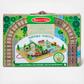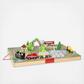• 17-piece railroad play set with wooden storage case that unfolds to create playing surface with built-in tracks