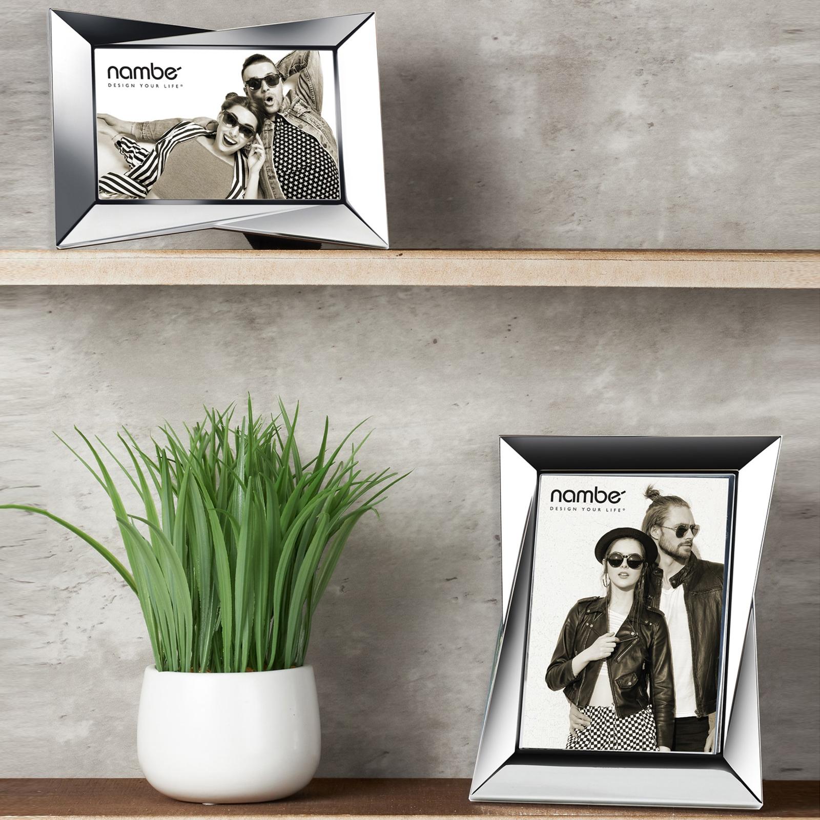 The Nambe Bevel frame collection in Nambe alloy is a tribute to Mid-Century Modern design with the dramatic geometric form. Geometric shapes and patterns are one of the hallmarks of mid-century modern design and are perfectly translated to the Bevel Frame collection.
