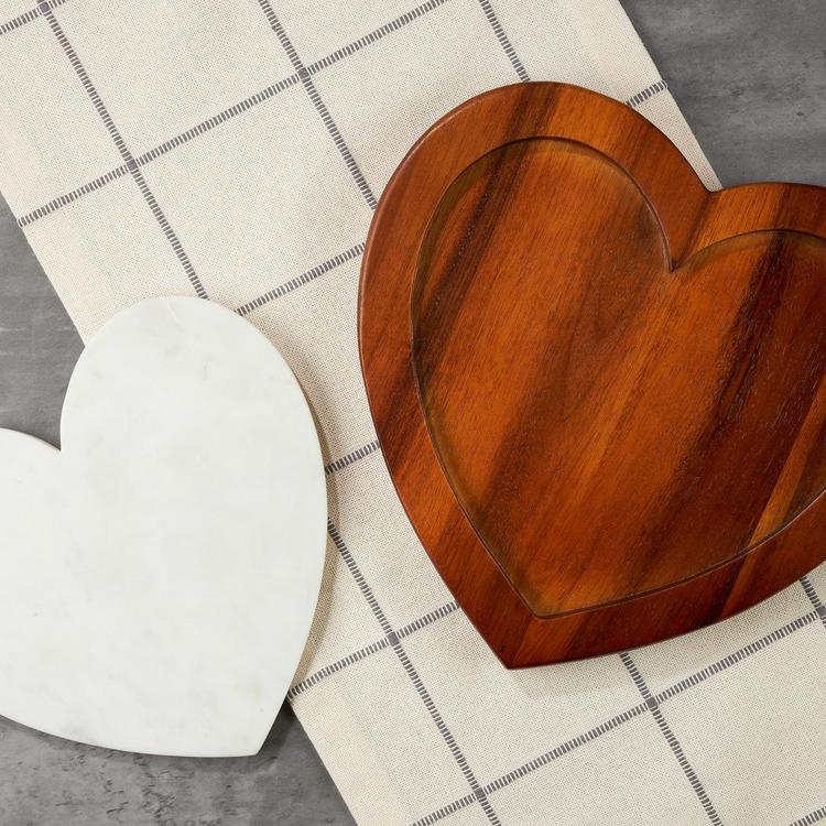 Eat Your Heart Out, heart shaped entertaining pieces that embrace the relationship between natural materials and the universal symbol of love, the heart. Spread the love with this heart shaped cutting board. A removable marble insert nestled inside an acacia wood base makes this piece perfect for charcuterie and much more.