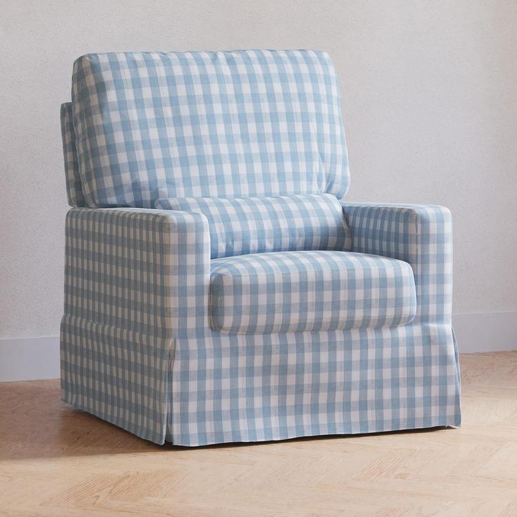 A beautifully crafted waterfall skirt softens the track arm silhouette of Crawford Glider. The plush pillow back cushion brings nursery comfort to a new level along with a lumbar pillow and wide seat. Its smooth, back-and-forth gliding motion helps you rock your baby to sleep with ease, while the convenient swivel creates an inviting repose for both you and your baby.
