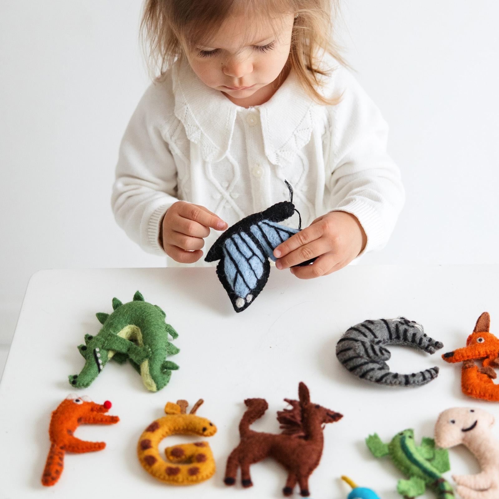 Introduce letters in a playful and memorable way with this handmade animal alphabet toy set. Each alphabet letter is shaped like an animal, helping children associate letters with animal names while encouraging early literacy, letter recognition, and hands-on learning through play. These handmade alphabet toys are Fair Trade certified and crafted using nontoxic materials, including Azo-free dyes, and ethical craftsmanship. They are ideal for toddler learning, Montessori play, nursery décor, and preschool educational activities. This animal alphabet set supports learning through play while helping build early language and cognitive skills.