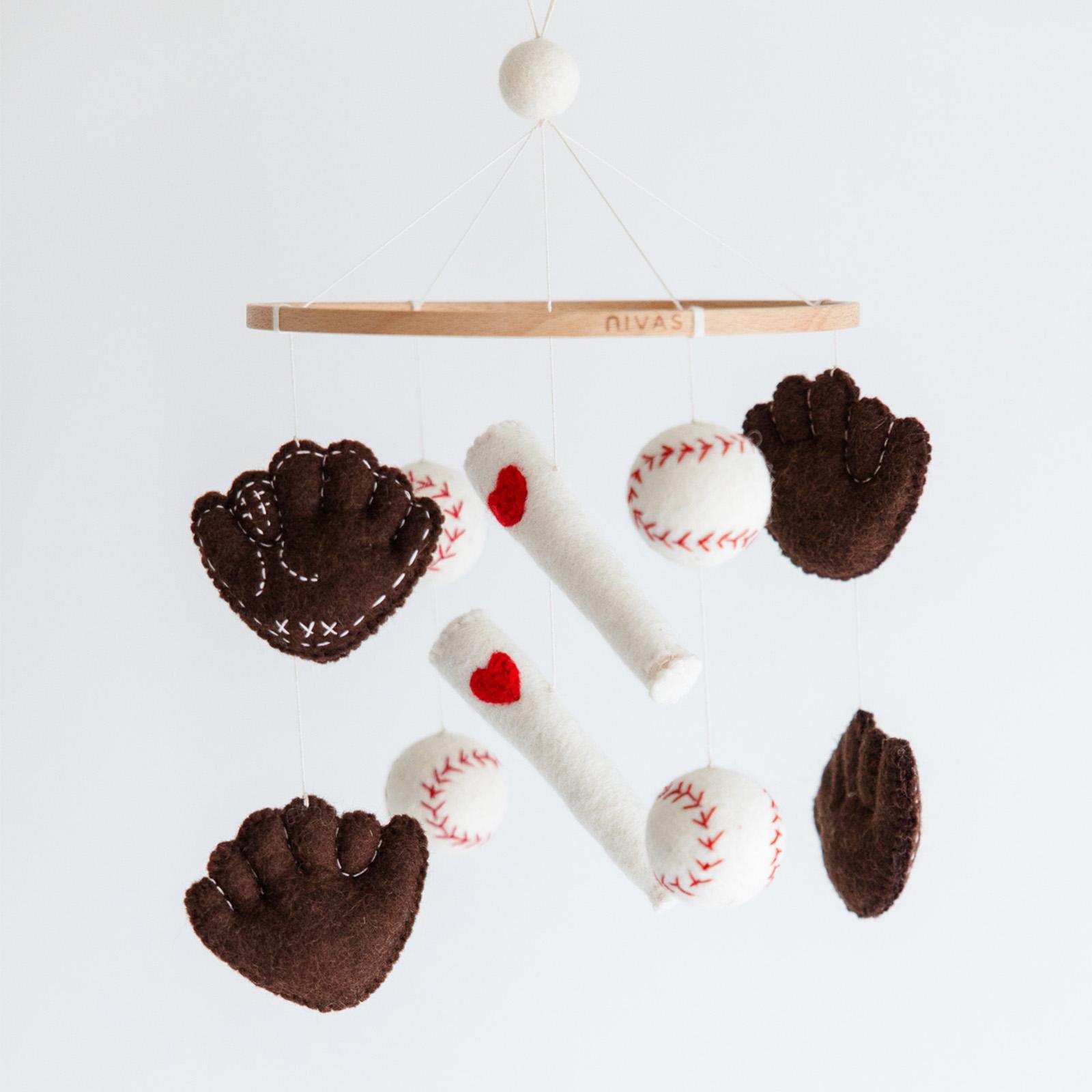 Add a sporty and playful touch to your baby’s nursery with this handmade baseball baby mobile. Featuring baseballs and sports-inspired elements, this crib mobile creates gentle overhead movement while complementing baseball theme nurseries, sports nurseries, all-star nurseries, and gender-neutral baby rooms. Each handmade nursery mobile is Fair Trade certified and comes ready to hang with a sturdy cotton loop for easy display above a crib, bassinet, or changing table. Additional hanging hardware or crib arm not included. Due to the handmade nature of this baby mobile, colors and sizes may vary slightly, making each piece unique.
