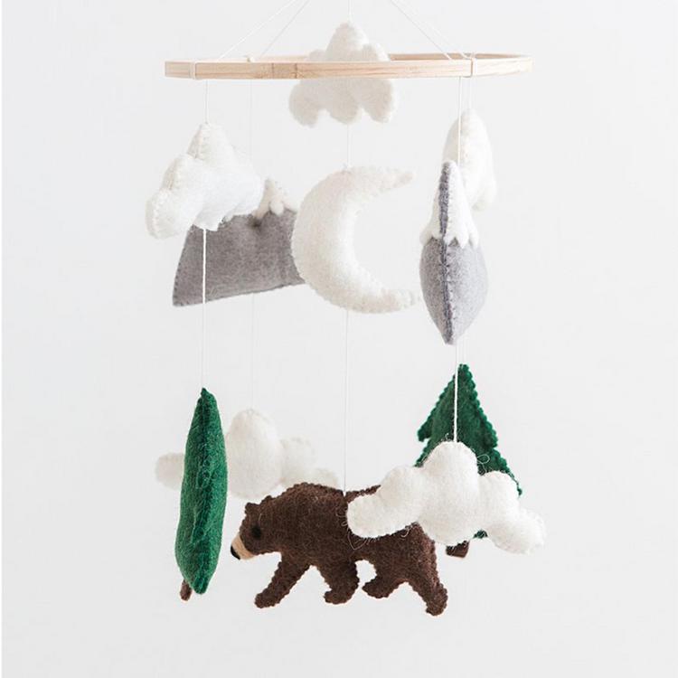 Add a cozy woodland accent to your baby’s nursery with this handmade bear baby mobile. Featuring a sweet bear and nature-inspired elements, this crib mobile creates gentle movement overhead while complementing woodland nurseries, forest theme nurseries, and gender-neutral baby rooms. Each handmade nursery mobile is Fair Trade certified and comes ready to hang with a sturdy cotton loop for easy display above a crib, bassinet, or changing table. Additional hanging hardware or crib arm not included. Due to the handmade nature of this baby mobile, colors and sizes may vary slightly, making each piece unique.