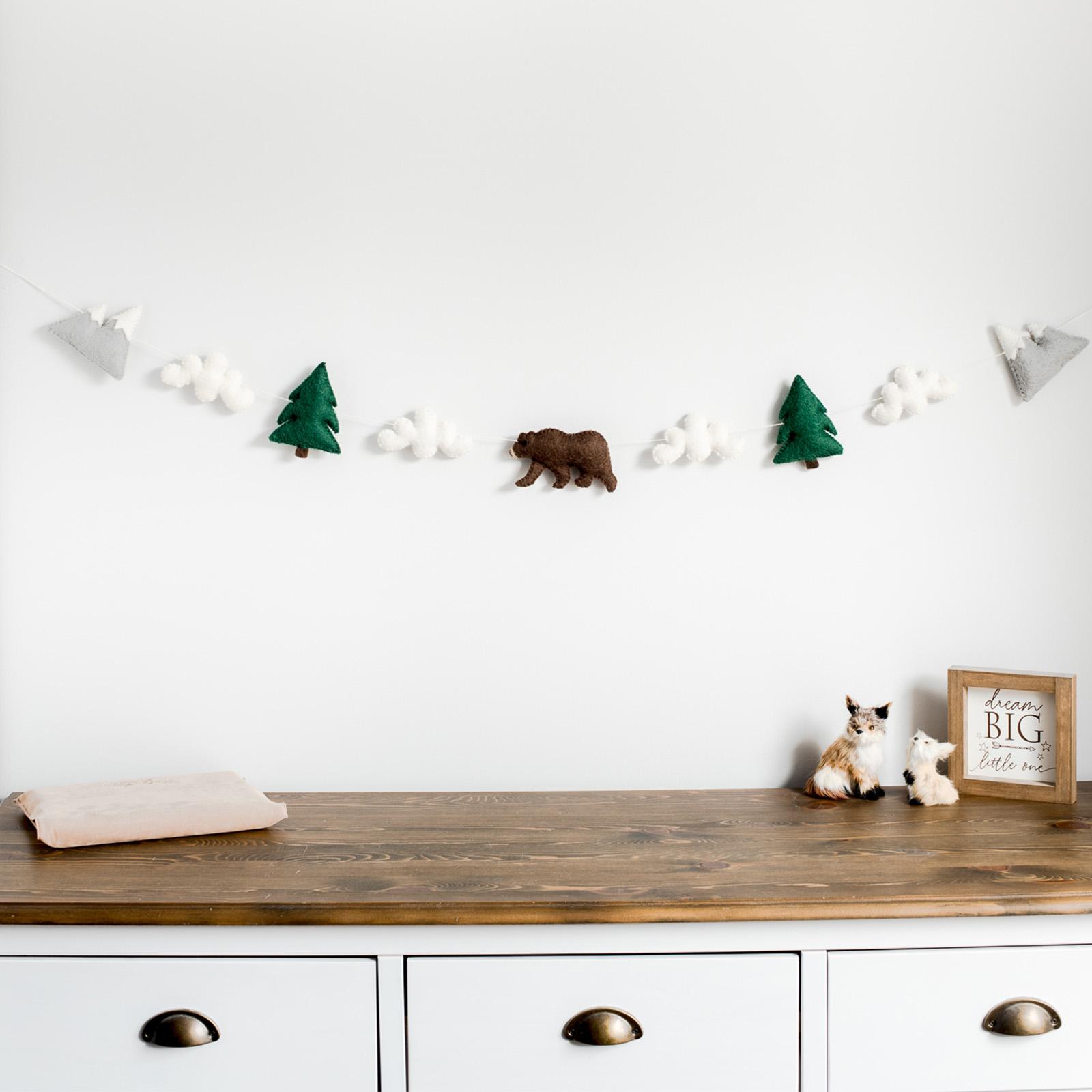 Bring a peaceful woodland scene to your child’s space with this handmade bear and mountain garland. Featuring bears and mountain shapes, this garland adds a nature-inspired touch to nurseries, playrooms, and woodland-themed rooms while creating a calm and adventurous atmosphere. This handmade nursery garland is Fair Trade certified and crafted using nontoxic materials and ethical craftsmanship by skilled women artisans. Lightweight and easy to hang, it is perfect for nursery wall décor, woodland theme nurseries, mountain theme nurseries, and gender-neutral baby rooms. Each piece is carefully made, making it a meaningful addition to your child’s space.